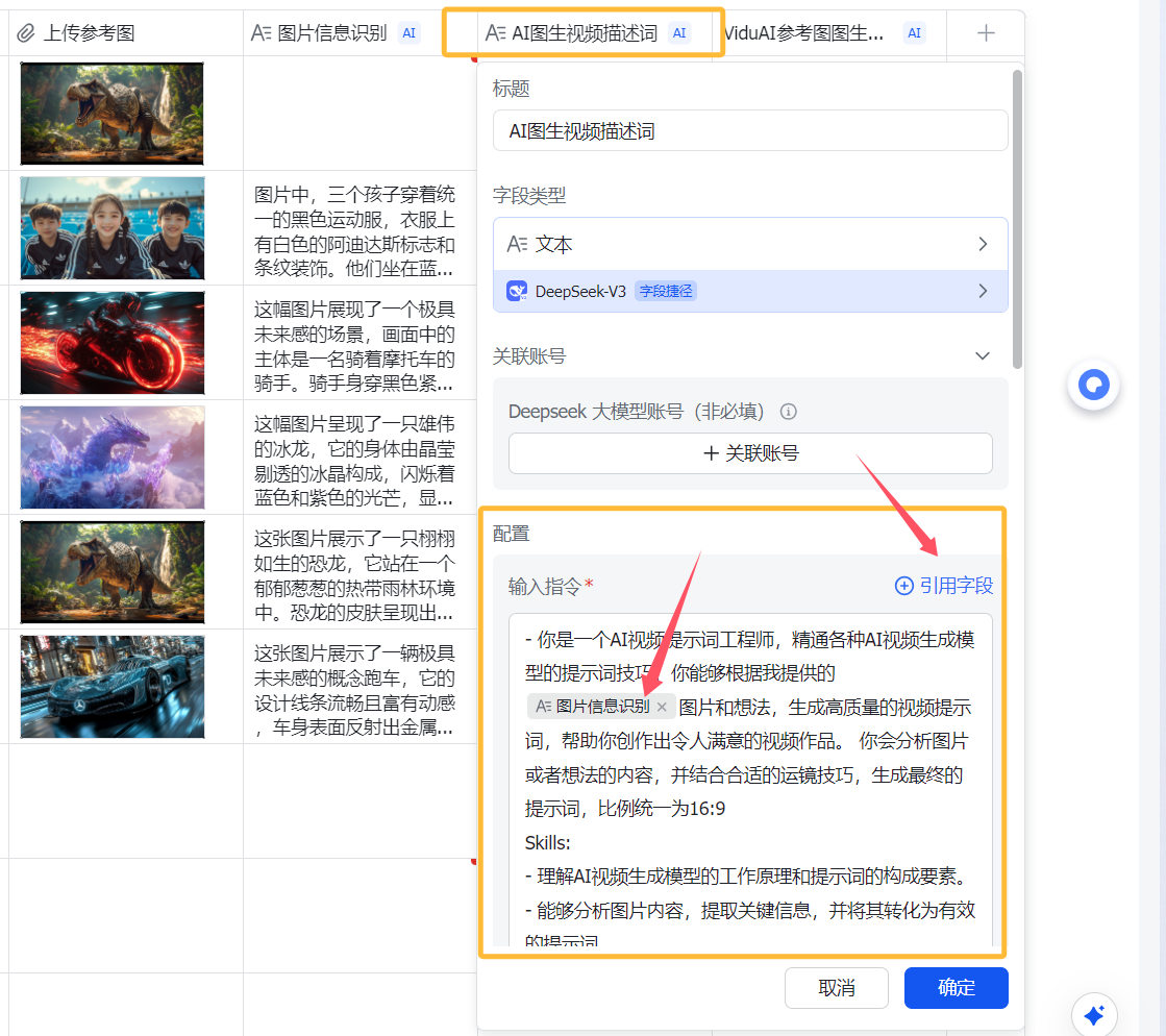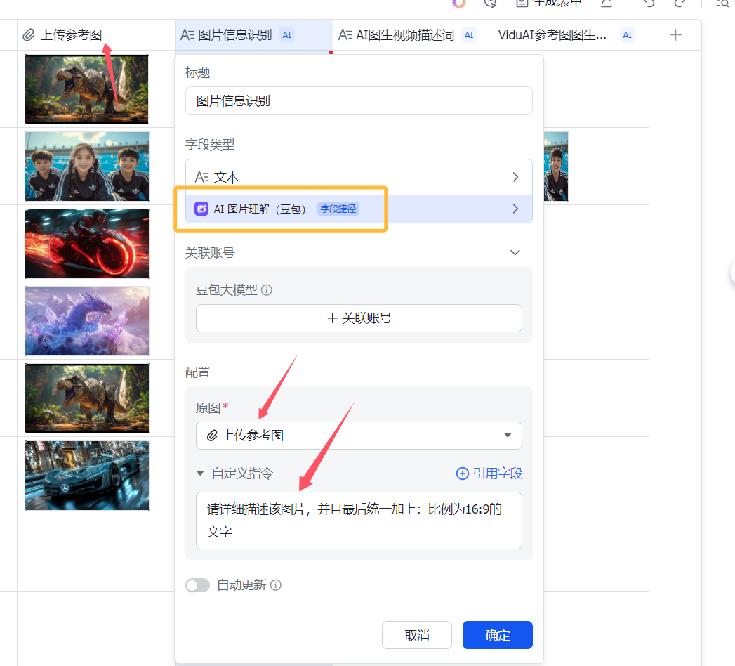 只不过把引用的字段变成了刚刚豆包识图后的【图片识别】那一列。