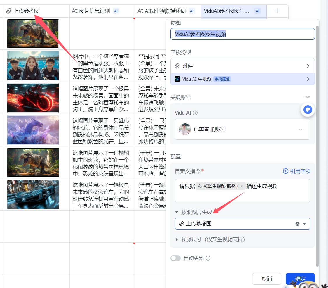 最后就很简单了,还是请出vidu,最后一列,加入vidu的字段捷径,不过这里的选项要有所变化,因为要参考参考图,所以要选择【按图片生成】,选中参考图那一列,然后自定义指令里面,让vidu根据图生视频提示词那一列生成视频即可。