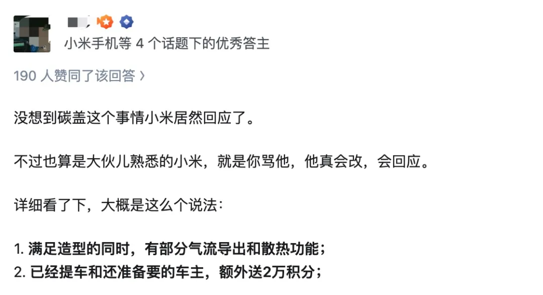 再然后,就是昨天临近凌晨的深夜道歉,首批交付的 SU7 Ultra 碳纤维双风道前舱盖被用户实测发现导流效果存疑,甚至被戏称为“装饰性开孔”。小米虽以“限时改配+2 万积分补偿”平息争议,但网络上的各路水军洗地行为更平添了车主、路人的怒火。