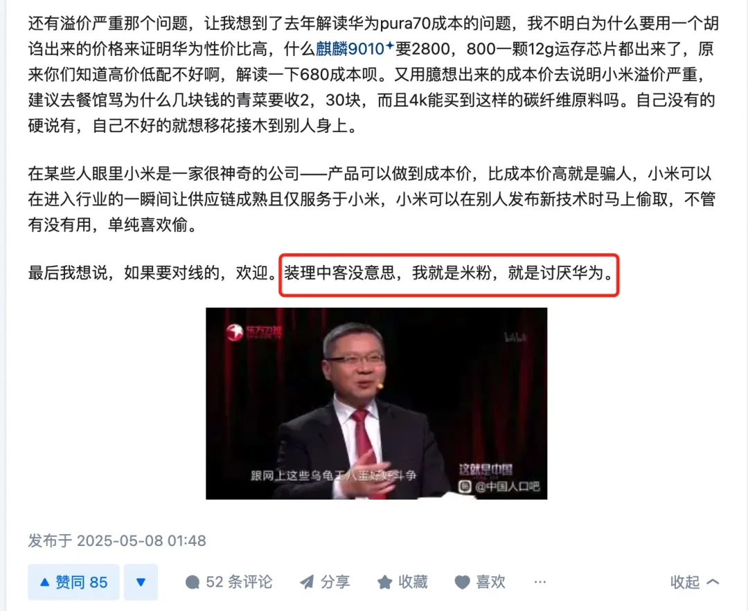 当小米品牌一直在做冲击高端的努力,也拿出了 SU7 这样现象级的产品,吸引了非常大的路人好感的同时,极端粉们在不遗余力地嘲讽那些具备购买力的“高端人士”,这些为小米品牌拉来无数流量的庞大群体,正在日益成为品牌本身的负资产。