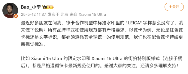 据界面新闻,5月12日,小米相机部的产品经理@Bao_小李 发文解释徕卡合作机型中标准水印里的“LEICA”字样为何消失。他表示,“所有品牌样式和使用规范都有严格要求。以徕卡为例,无论是红色徕卡标还是文字标识,都必须遵循其全球统一的使用规范,我们也在配合徕卡持续更新视觉标准。比如Xiaomi 15 Ultra的限定水印和Xiaomi 15 Ultra的街拍特别版样式(连接手柄后),都是严格遵循徕卡最新规范使用的。”
