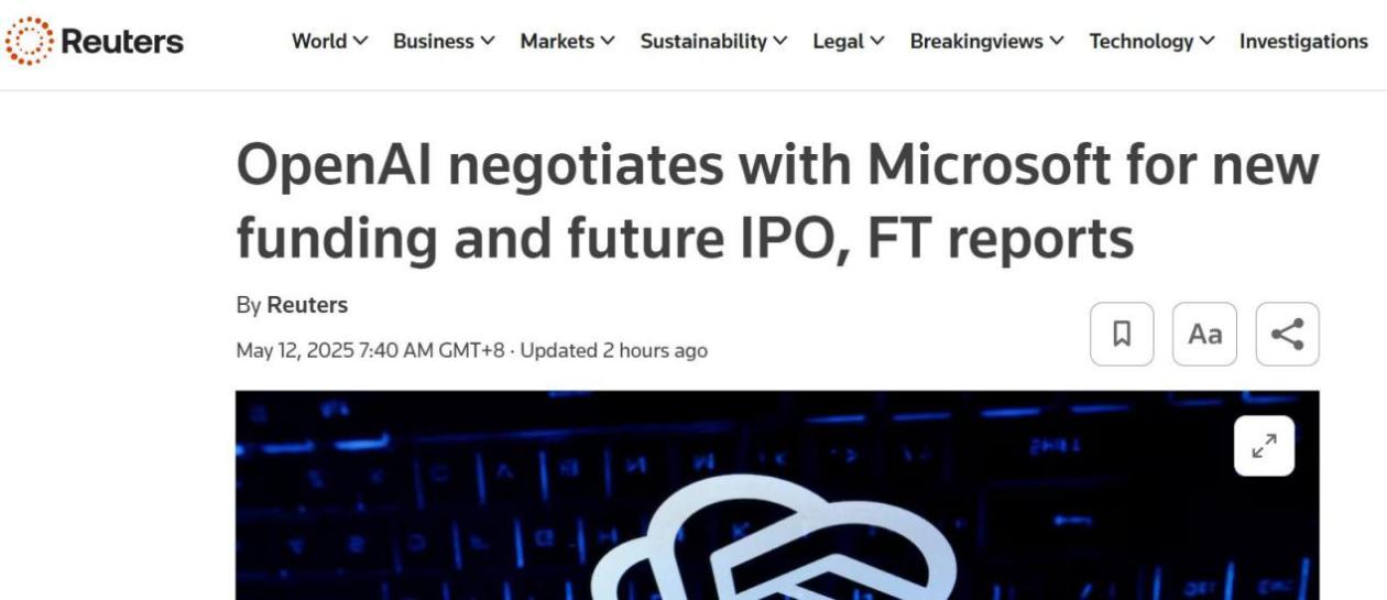 据环球网,5月12日消息,据外媒《金融时报》报道称,OpenAI正在与微软就新一轮融资和未来首次公开募股(IPO)进行谈判。