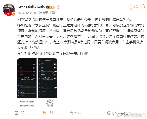 据财经网科技,5月12日,特斯拉副总裁 @Grace陶琳-Tesla 微博发文表示:“刚刚拿到驾照的孩子独自开车,哪怕只是几公里,做父母的也难免会担心。特斯拉的“家长控制”功能,正是为这样的场景设计的。家长可以设定车辆的最高速度、限制加速度,还可以一键开启包括紧急制动辅助、盲点警报、车道偏离辅助等在内的一系列主动安全功能。这些设置一旦开启,驾驶员是无法自行更改的。它还支持“宵禁通知”,晚上11点到凌晨4点之间,只要车辆被启用,车主手机就会立刻收到提醒。”