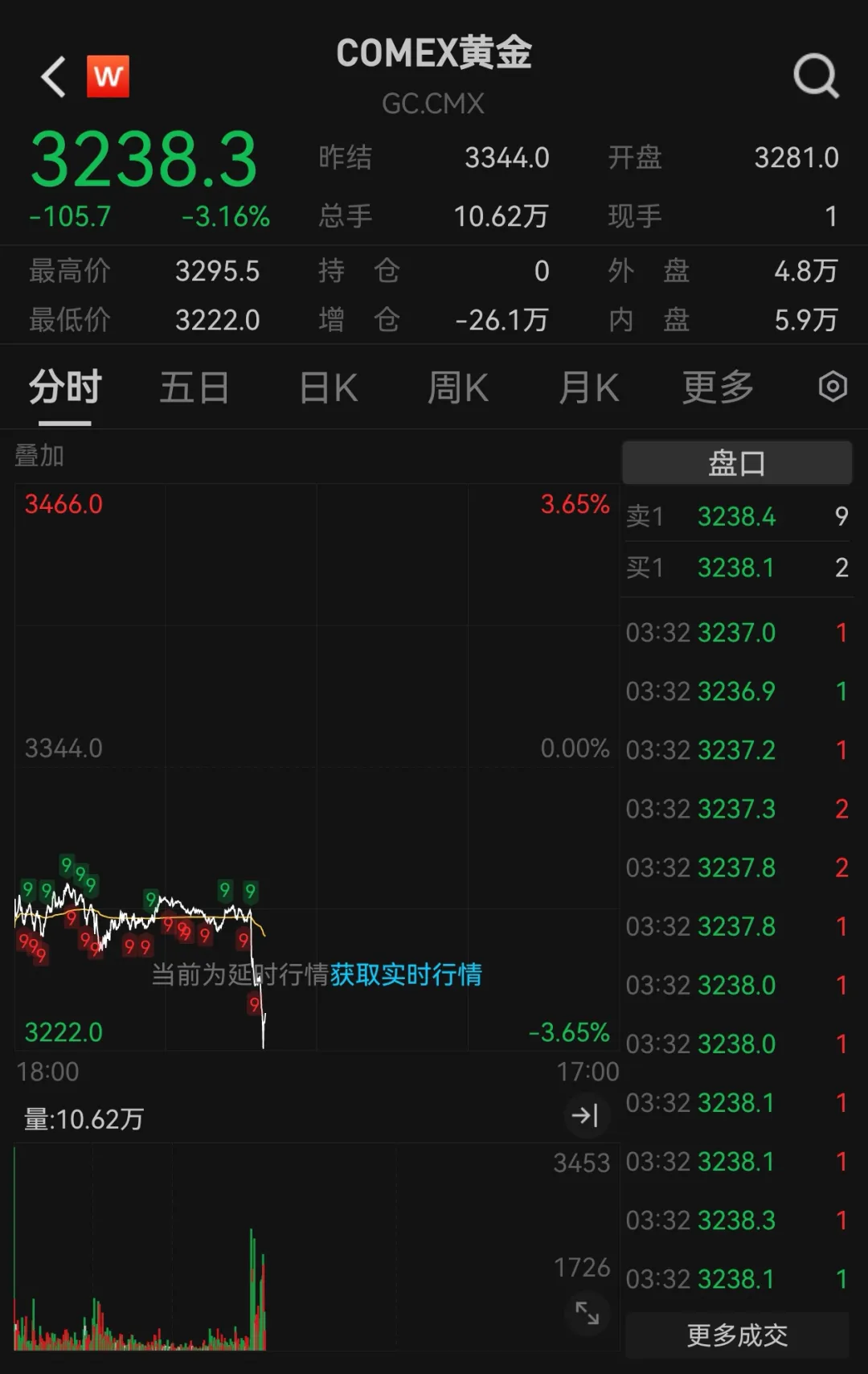 截至15:48,COMEX黄金一度跌破3230美元/盎司,最低触及3222美元/盎司,跌幅超3%;伦敦现货黄金一度跌破3220美元/盎司,最低触及3216.845美元/盎司,跌幅超3%,创5月来新低。