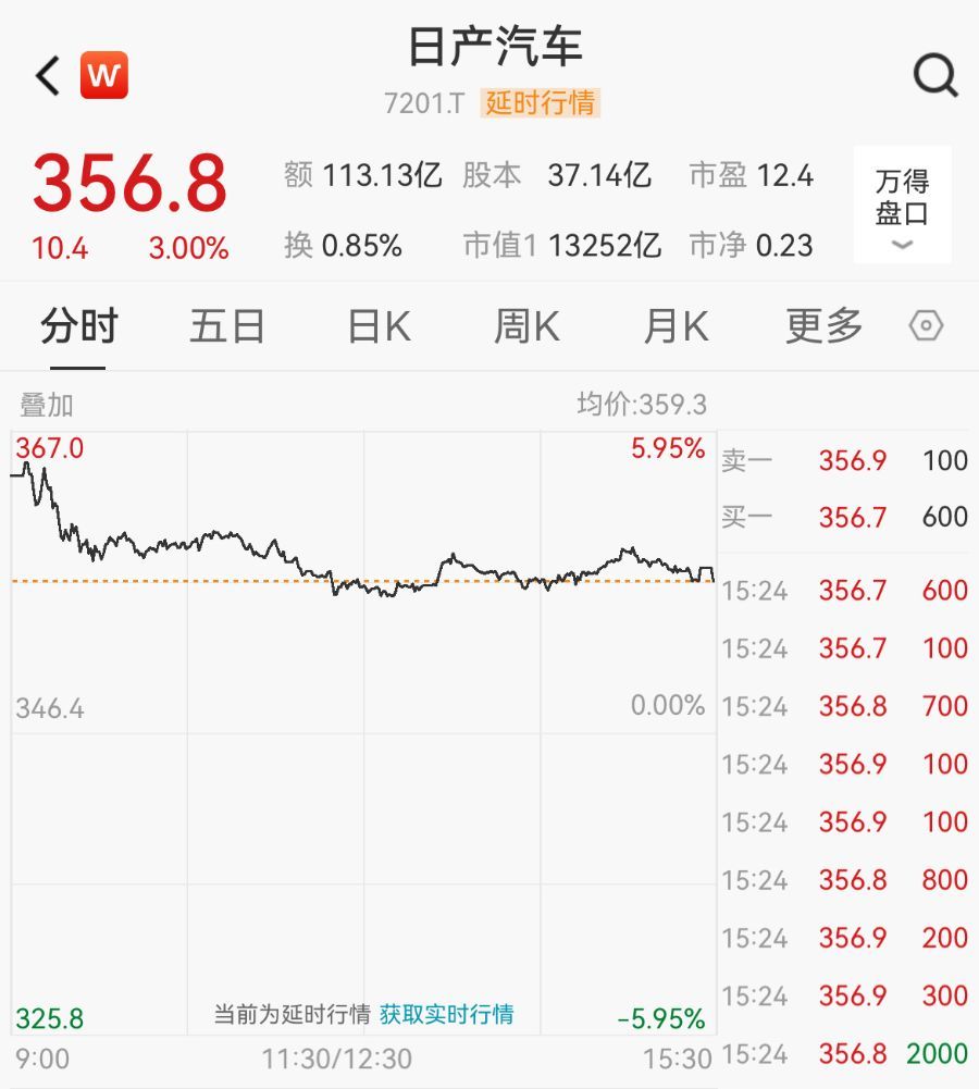 截至5月13日收盘,日产汽车涨3%,报356.8日元/股,今年以来股价已跌去25.67%。