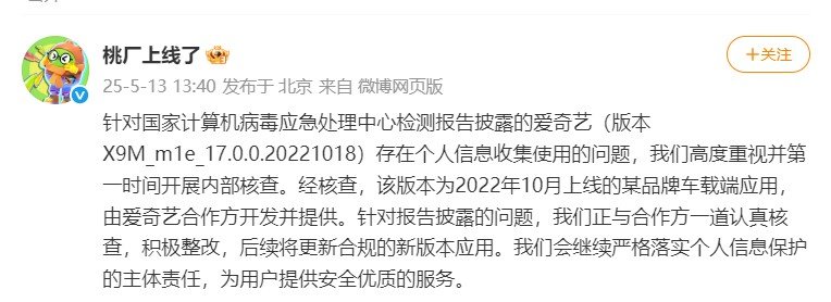 据经济观察网,5月13日,爱奇艺公司官方发言人@桃厂上线了 发文称,针对国家计算机病毒应急处理中心检测报告披露的爱奇艺(版本X9M_m1e_17.0.0.20221018)存在个人信息收集使用的问题,公司高度重视并第一时间开展内部核查。经核查,该版本为2022年10月上线的某品牌车载端应用,由爱奇艺合作方开发并提供。针对报告披露的问题,公司正与合作方一道认真核查,积极整改,后续将更新合规的新版本应用。公司会继续严格落实个人信息保护的主体责任,为用户提供安全优质的服务。
