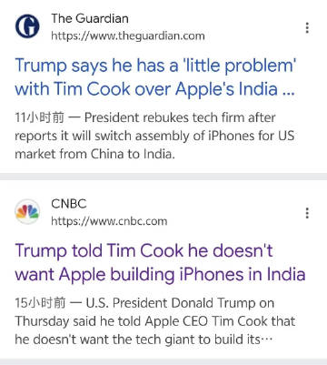 但特朗普在周四对媒体表示,他在前一天与苹果公司的CEO蒂姆·库克见面时告诉后者,他对苹果公司在印度生产iPhone是“有些意见”的,因为他希望苹果将生产线放在美国。