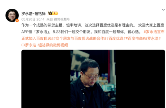 据界面新闻,近日,罗永浩正式宣布与百度优选达成战略合作,将于5月23日晚8点在该平台开启首场直播,这是继抖音、淘宝、京东后,罗永浩第四次开辟直播电商新战场。