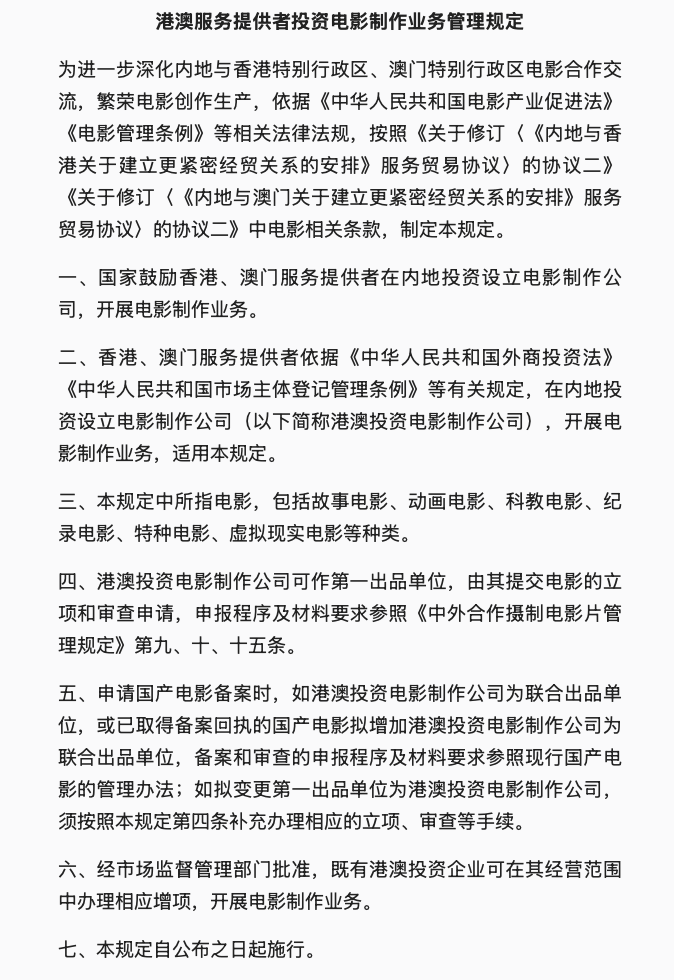 据央视新闻,国家电影局近日发布管理规定,鼓励香港、澳门服务提供者在内地投资设立电影制作公司,开展电影制作业务。港澳投资电影制作公司可作第一出品单位,由其提交电影的立项和审查申请,申报程序及材料要求参照《中外合作摄制电影片管理规定》第九、十、十五条。经市场监督管理部门批准,既有港澳投资企业可在其经营范围中办理相应增项,开展电影制作业务。