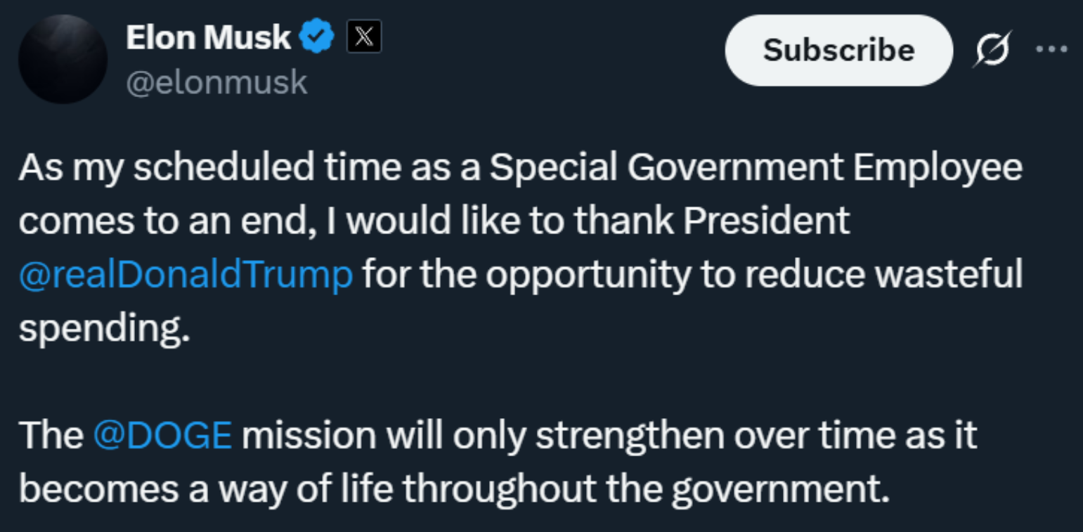 据央视新闻,当地时间5月28日,美国政府效率部负责人埃隆·马斯克在其社交媒体平台X上发文表示,他即将离开特朗普政府,不再继续担任特别政府雇员一职。此外,马斯克在文中向美国总统特朗普致谢,并表示政府效率部(DOGE)团队将继续在整个政府范围内开展工作。