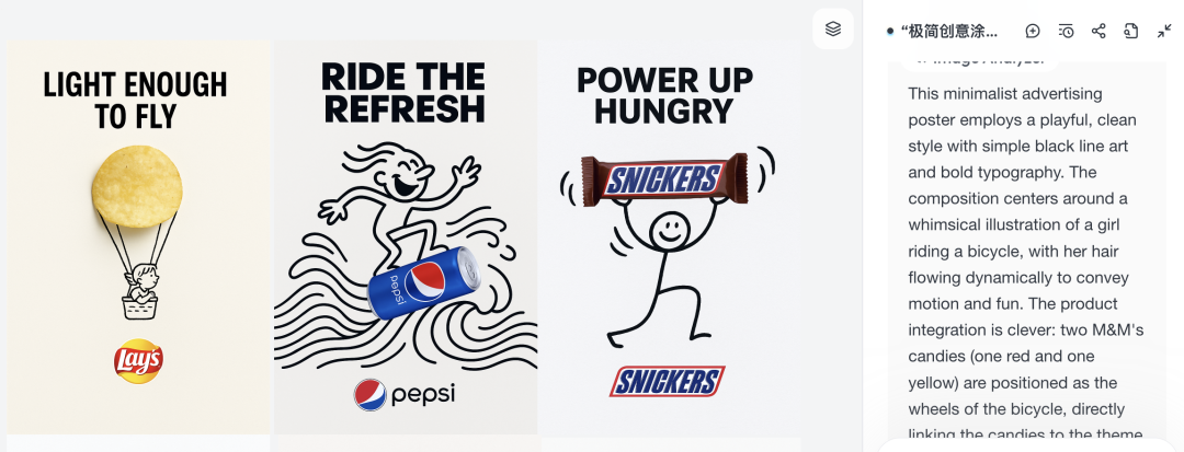 整体来说,效果还是非常不错。这意味着,我不用再一张张做创意了,一张张做设计,而是设计一个可被AI调用的创意生产公式,直接系列出图。
