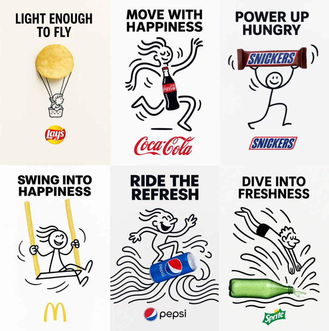 生成品牌的极简创意涂鸦广告海报,需要将真实的产品巧妙融入黑色线条勾勒涂鸦场景,产生趣味互动或意象表达。涂鸦富有巧思,简洁线条、扁平风格、趣味十足。 在画面上方添加粗体黑色短句文案,文案点题、富有创意。底部清晰呈现产品logo。3:4比例。 请分别输出乐事薯片、Dior口红、百事易拉罐、士力架、麦当劳薯条、雪碧海报。