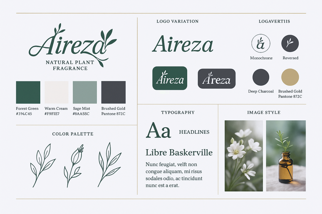 为天然植物香氛品牌Aireza生成一套完整VI视觉系统,风格简约自然。输出基础系统(LOGO、品牌色、字体、辅助图形、图像风格)与应用系统(包装、名片、产品册、门店导视、社媒模板等)。