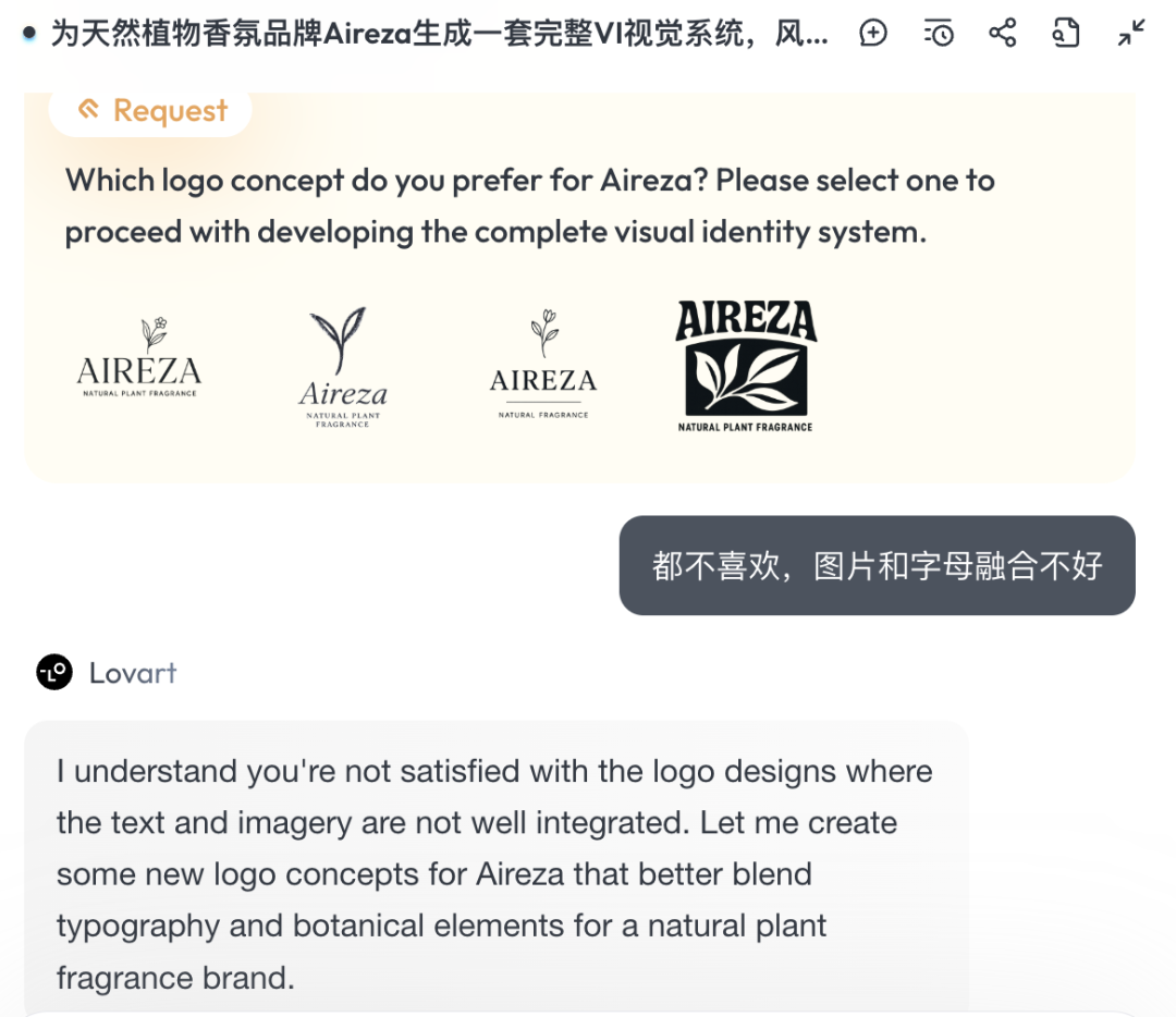 整个回答过程中让惊艳的是,在 Logo 生成阶段,它不是简单的给你画几个logo,它是会按照品牌做创意的步骤,先写Concept的!然后4 个初步概念方案生成后,询问我选择一个方向,并如果不满意,可以继续生成新的风格,直到我认可为止。