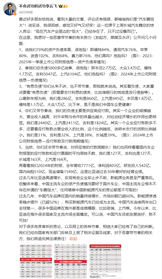 据凤凰网科技,5月30日,针对近期网络上关于“汽车圈恒大”的质疑声音,比亚迪集团-品牌及公关处总经理李云飞(@不会武功的武功李云飞)今日发布长文公开回应,逐一反驳相关指控。