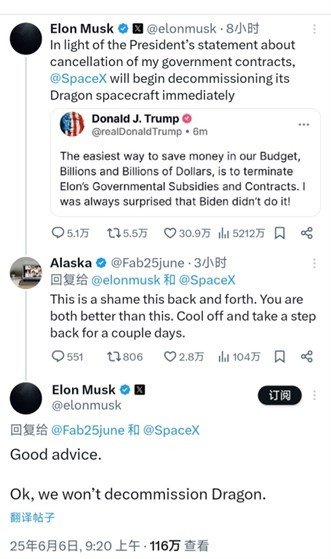 不过,此番热闹的网络“口水战”仅在几小时后就发生“反转”。马斯克在社交平台回复一则建议他“冷静几天”的评论帖子时表示:“好建议,好的,我们不会让‘龙’飞船退役。”