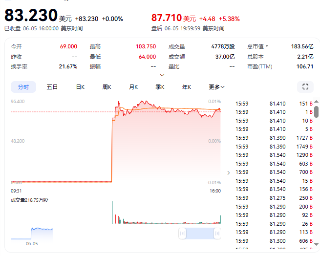 据财联社援引科创板日报,“稳定币第一股”如期上市。美东时间6月5日,Circle正式登陆纽交所(股票代码“CRCL”)。其IPO发行价为每股31美元(发行价指导区间为27-28美元),上市首日经历两次熔断后涨幅一度超2倍,盘中股价最高超过103美元。