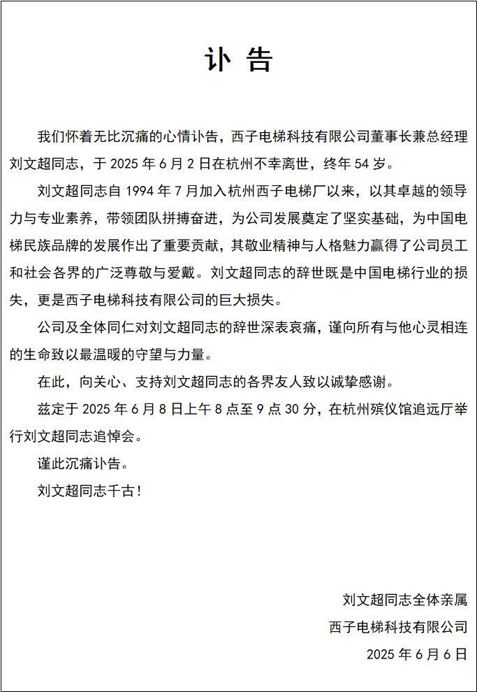 据澎湃新闻,针对“西子电梯总裁刘文超坠楼身亡”的消息,6月6日,西子电梯科技有限公司发讣告称,西子电梯科技有限公司董事长兼总经理刘文超同志,于2025年6月2日在杭州不幸离世,终年54岁。
