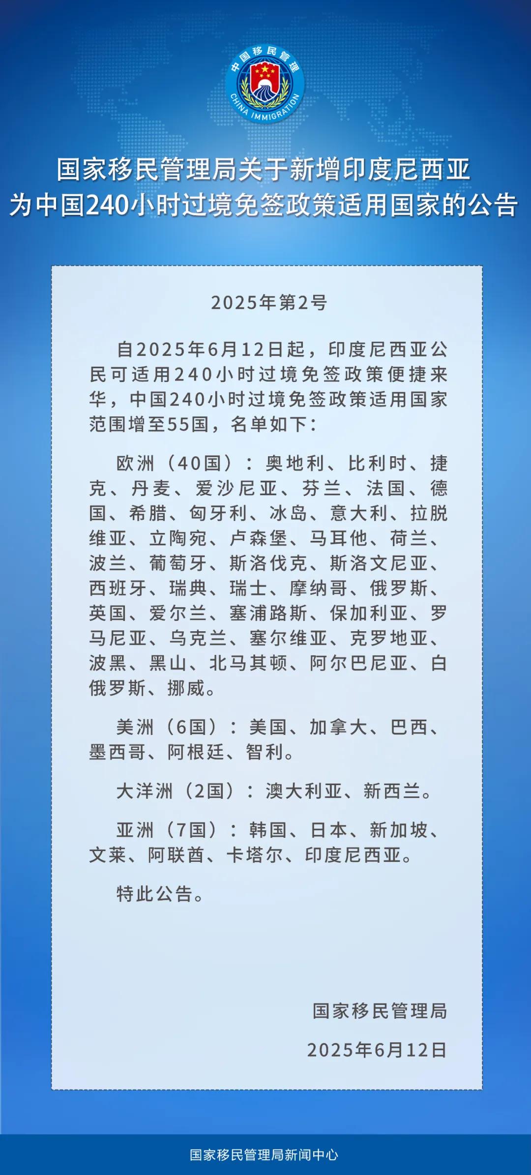 目前,印度尼西亚、俄罗斯、英国等55国人员持有效国际旅行证件和确定日期及座位的联程客票,从中国过境前往第三国或地区,可从北京、上海等24个省(区、市)60个开放口岸中的任一口岸免签入境,并在规定区域停留活动不超过10天。