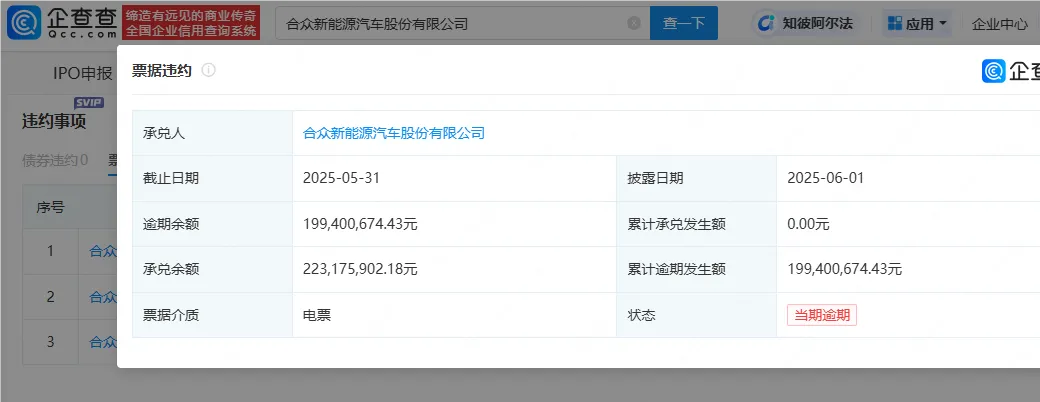 据相关平台显示,哪吒汽车所属合众新能源汽车股份有限公司截至5月底,票据违约累计逾期发生额约1.99亿元。