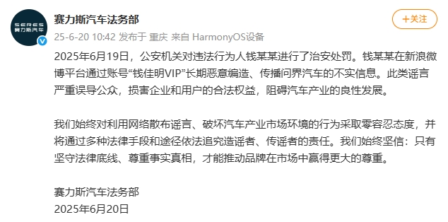 据界面新闻,6月20日,赛力斯汽车法务部发文称,6月19日,公安机关对违法行为人钱某某进行了治安处罚。钱某某在新浪微博平台通过账号“钱佳明VIP”长期恶意编造、传播问界汽车的不实信息。此类谣言严重误导公众,损害企业和用户的合法权益,阻碍汽车产业的良性发展。我们始终对利用网络散布谣言、破坏汽车产业市场环境的行为采取零容忍态度,并将通过多种法律手段和途径依法追究造谣者、传谣者的责任。