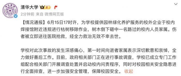 据界面新闻,清华大学发布情况通报:6月15日17时许,为学校提供园林绿化养护服务的校外企业于校内焊接馆附近违规进行枯树移除作业,树木倒下砸中一名路过的校内人员家属。伤者被立即送往医院抢救,经全力救治无效不幸去世。 学校对此次事故的发生深感痛心,第一时间向逝者家属表示深切歉意和哀悼,全力做好善后工作。目前,政府相关部门正在进行事故调查,学校已成立专门工作组配合相关部门开展调查处置并启动校内问责程序,同时对校园相关安全隐患进行全面排查,进一步加强安全管理,保障校园安全。