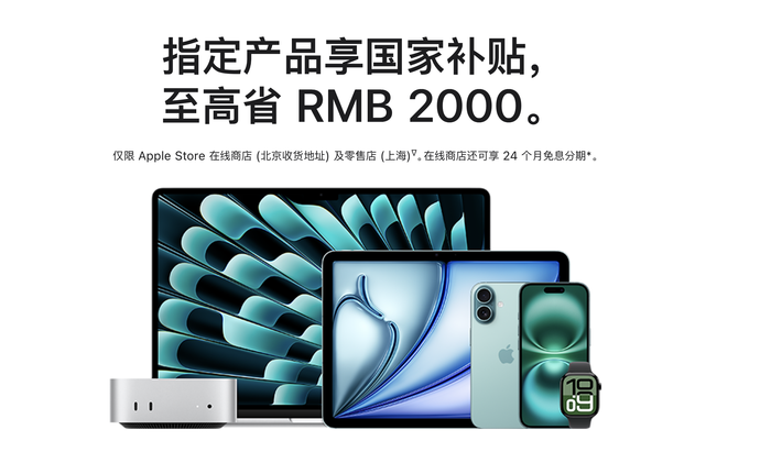 据界面新闻,符合资格的消费者购买参与活动的iPhone、iPad、Apple Watch时,可享商品到手价基础上再立减15%的国家补贴,每件补贴不超过500元,仅限到手价不超过6000元的单件商品;购买参与活动的Mac时,可享商品到手价基础上再立减20%的国家补贴,每件补贴不超过2000元。