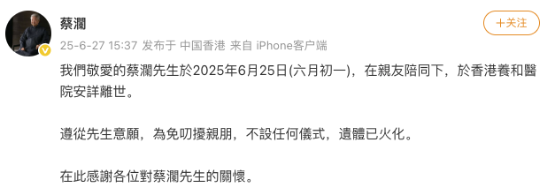 据界面新闻,@蔡澜 官方微博发布消息,蔡澜先生于2025年6月25日(六月初一),于香港养和医院安详离世。