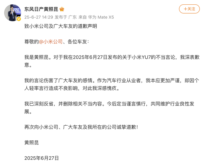 据界面新闻,6月27日下午,微博认证为“东风日产新能源黄照昆”的东风日产高管发布道歉声明称,对于其在2025年6月27日发布的关于小米YU7的不当言论,深表歉意。“我已深刻反省,并删除相关不当内容。今后定当谨言慎行,共同维护行业良性发展。”