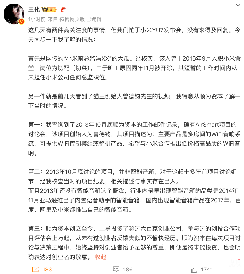 据凤凰网科技,6月27日,针对网传小米总监冯XX大瓜的传闻,小米集团公关部总经理王化发文回应表示,经核实该人曾于2016年9月入职小米食堂,岗位为切配(切菜),由于旷工原因同年11月被开除,其短暂的工作时间内从未担任小米公司任何总监职位。