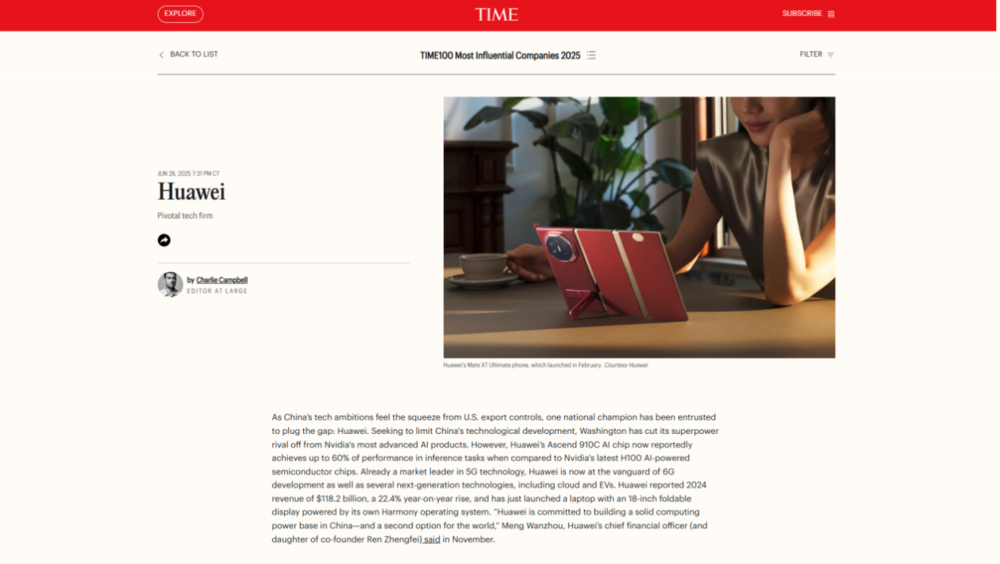 《时代》周刊称,作为5G技术的市场领导者,华为如今也处于6G开发以及云计算和新能源汽车等多项下一代技术的前沿。华为年报显示2024年公司营收达到1182亿美元,同比增长22.4%,并刚刚推出了一款搭载自家鸿蒙操作系统、配备18英寸可折叠屏幕的笔记本电脑。华为首席财务官孟晚舟在去年11月表示:“华为致力于为中国打造坚实的算力底座,也为世界提供第二选择。”