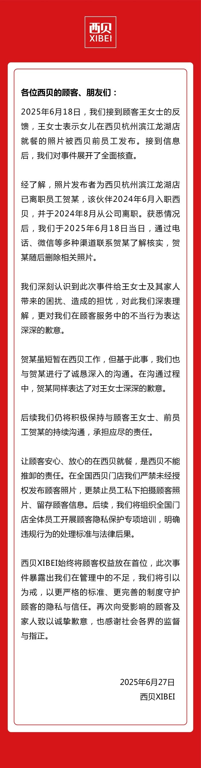 据封面新闻,6月27日,媒体报道称,杭州有家长反映,其6岁的女儿被西贝男服务员偷拍照片并当背景图。对此,西贝餐饮官微27日发声明表示,经核查,涉事员工为已离职员工贺某,经沟通贺某已经删除相关照片。西贝对于贺某在顾客服务中的不当行为表达深深的歉意。西贝表示,在全国所有门店西贝严禁未经授权发布顾客照片,更禁止员工私下拍摄顾客照片、留存顾客信息。西贝将组织全国门店全体员工开展顾客隐私保护专项培训,明确违规行为的处理标准与法律后果。
