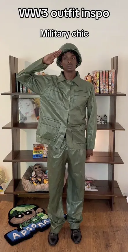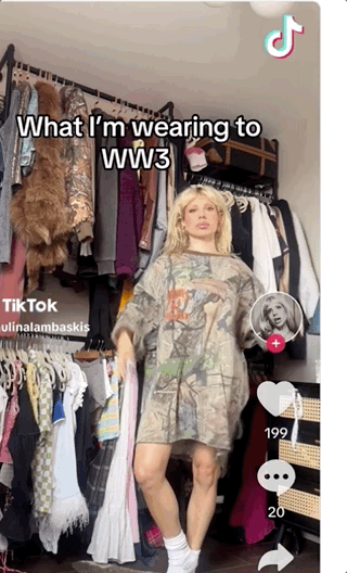 这类作品通常打上“#WW3”的标签,以Kesha的流行歌曲《Blow》为背景音乐,并配上“我该穿什么参加第三次世界大战?”这样的文字描述。