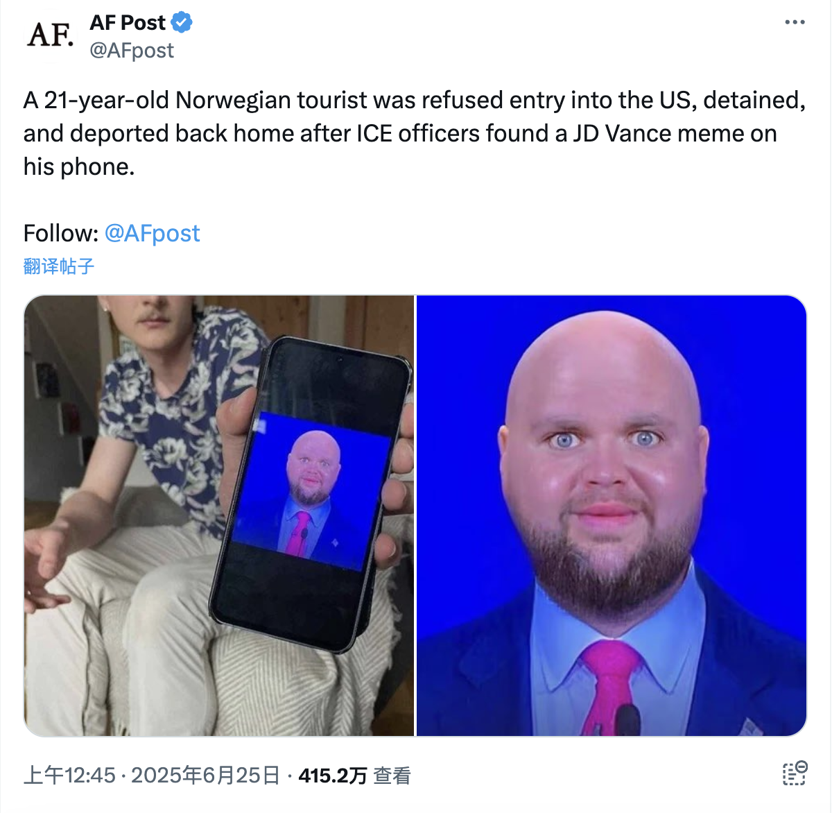 挪威游客因持有JD万斯表情包被美国海关遣返回国?