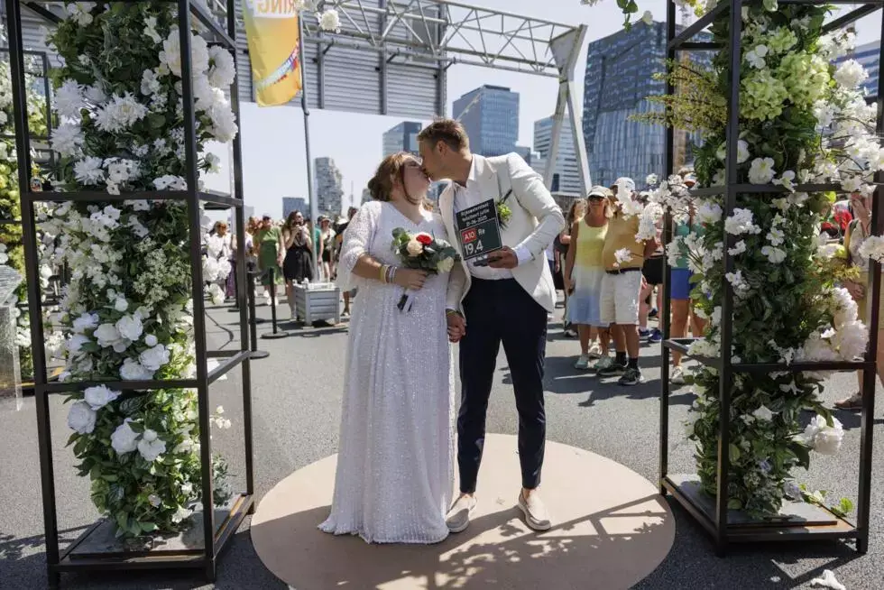 在高速上的婚礼绝不是一个安静而私密的仪式。大约有 25 万名派对参与者购买了婚礼门票,路人为每场婚礼欢呼鼓掌。