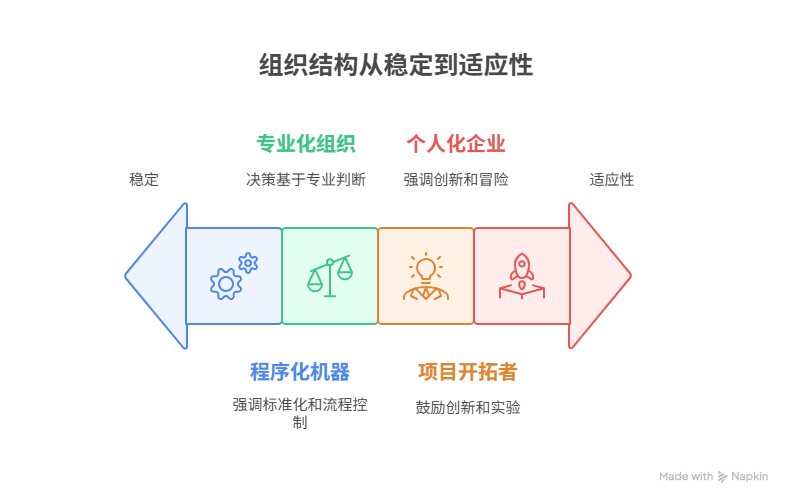 而在个人化企业中,通常把权力集中在一个人。当一个个人化企业的负责人说“跳!”,他的下属回答经常是:“跳多高,尊敬的先生?”而一家医院的院长说,“跳!”医生们会问:“为什么要跳?”项目开拓者是另一种,工作高度技能化,也需要创新。而现实中绝大部分的管理理论以及书籍都是围绕前两种企业来进行的。