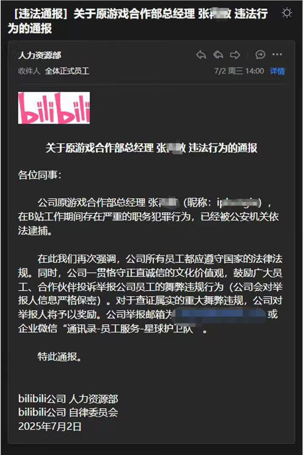 通报称,原游戏合作部总经理张某在B站工作期间存在严重的职务犯罪行为,已经被公安机关依法逮捕。在通报中,B站强调,公司所有员工都应遵守国家的法律法规。