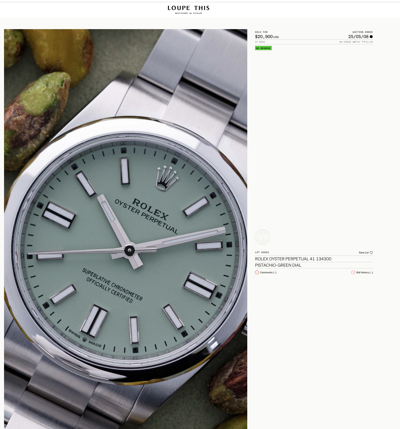 今年,劳力士为 Oyster Perpetual 表款新增开心果绿配色。在5月8日 Loupe This 拍卖会上,该款腕表以20900美元成交,接近原价三倍,足见市场对“绿色”与“特别版劳力士”的双重热情。