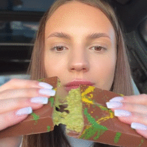 2023年12月,Tiktok网红Maria Vehera在车里分享了品味这款产品的视频。截至目前,这条视频播放量超过1亿,点赞710万,直接掀起了迪拜巧克力热潮,同时也让开心果绿成了被人关注的时尚灵感。