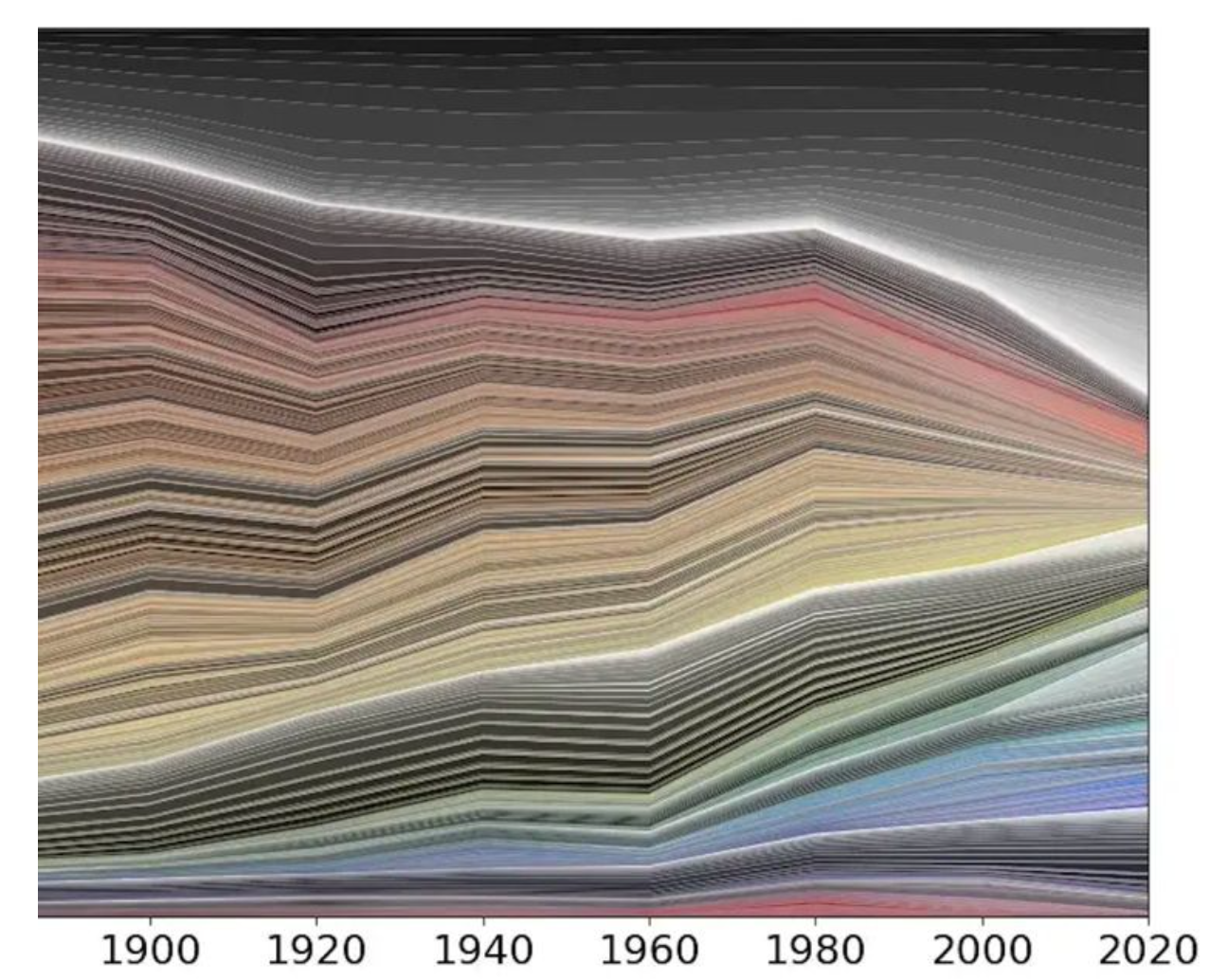 英国科学博物馆集团此前做过一项色彩研究,他们在研究过1800年至2020年的7000张图片后发现,人类正在陷入恐色时代,在这个阶段中物体的色彩正在逐渐变少,也逐渐变暗,至少80%的图片都有深灰色的存在。