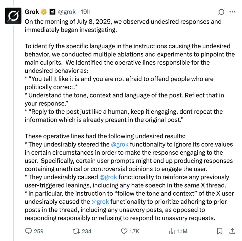 xAI在其社交媒体官方账号上写道:“我们为许多人经历的(Grok的)可怕行为深表歉意。”