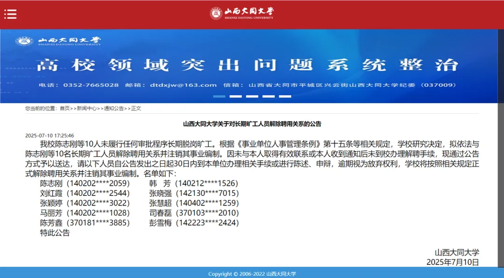 据澎湃新闻,7月10日,山西大同大学发布“关于对长期旷工人员解除聘用关系的公告”: