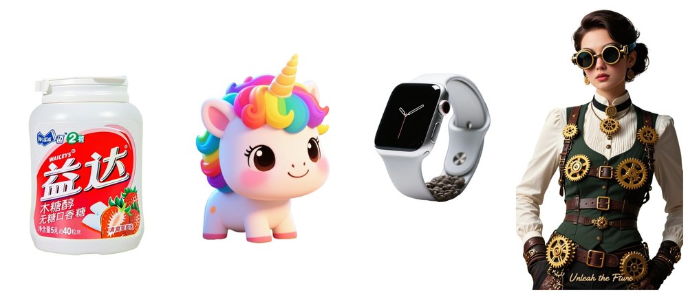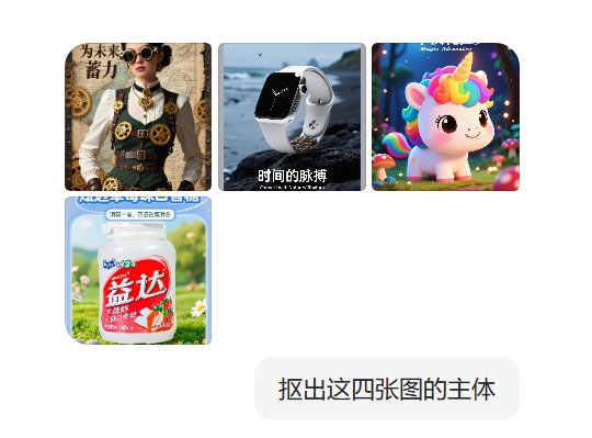 上传之后,只需要说一句:抠出这四张图的主体,就会自动把背景去掉,剩下主体。