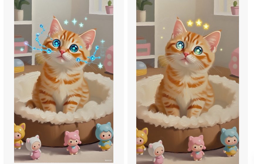 那么就可以直接上传多张图,比如下面这个案例,我选了四张风格不同的图片,想要把前三张的风格特点迁移到第四张图片,然后就得到一张全新风格的小猫咪了。