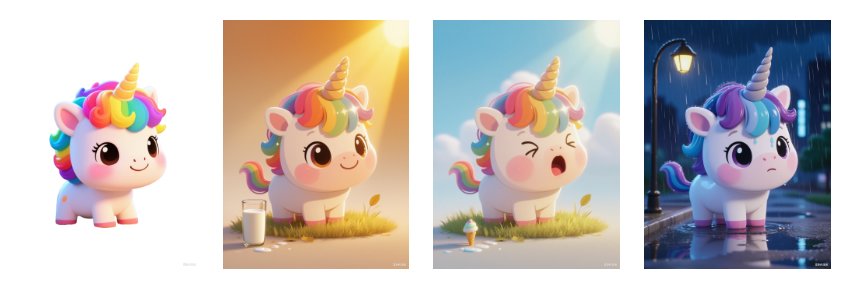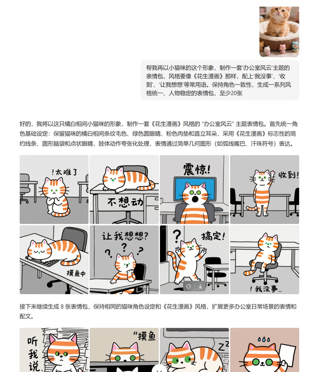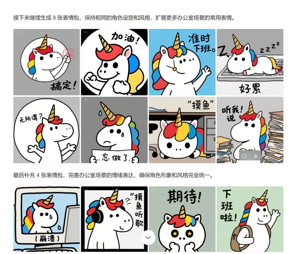 准是指一致性又有大幅度提升,比如先做个表情包试试,上传前面那个独角兽的形象,作为表情包的主体形象,然后我输入让以这个形象,生成《花生漫画》风格的表情包,一次性出20张,可以看看效果,真的是蛮惊艳的。