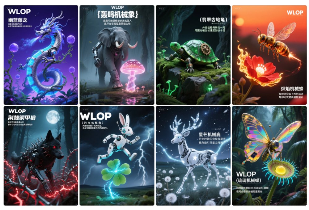 再用批量生成的玩法,发挥想象力,完全创造一个新世界:创造一个新世界,这个世界里的植物会发光,动物都是机械构成的,形成20个生物形象,并且制作成精美的卡牌配上合适的文字。