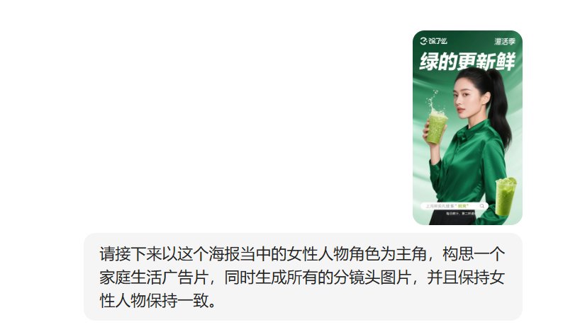 还有生成广告片分镜头,人物一致性也是强太多了,把下面这张海报主角丢进去,然后就生成一系列的分镜头了,还有更多的玩法,等着你探索,比如这样: