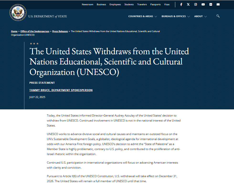 据央视新闻,美国国务院发言人塔米·布鲁斯当地时间7月22日发表声明称,美国已向联合国教科文组织总干事阿祖莱通报了美国退出该组织的决定。根据相关程序,美国将于2026年12月31日正式退出联合国教科文组织。