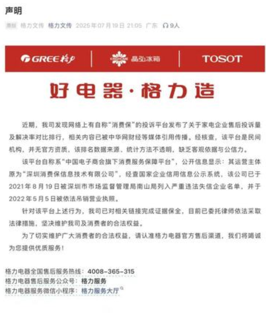 据界面新闻,7月19日晚间,珠海格力电器股份有限公司官方账号“格力文传”发文称,发现网络上有自称“消费保”的投诉平台发布了关于家电企业售后投诉量及解决率对比排行,相关内容已被中华网财经等媒体引用传播。经核查,该平台是民间机构,并无官方资质,该排名数据来源、统计方法不透明,缺乏客观依据与公信力。