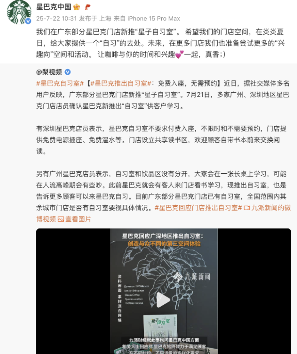 据界面新闻,7月22日,针对广东部分星巴克门店新推“星子自习室”一事,星巴克中国发文回应称,希望门店空间在炎炎夏日给消费者提供一个“自习”的去处;未来在更多门店也准备尝试更多的“兴趣向”空间和活动。